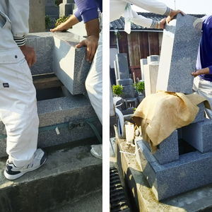 基礎工事が完了したら、いよいよ墓石を設置します。専用の接着剤や耐震用金具等を使用し、耐震性を高めて施工します。